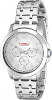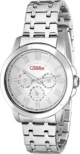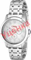 Традиция. Метки в виде римских цифр. Число и день недели отображаются на отдельных циферблатах. 12-ти и 24-х часовой формат времени. Заводная головка с защитой. Браслет с раскладывающейся застежкой.