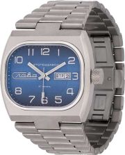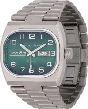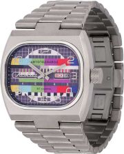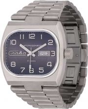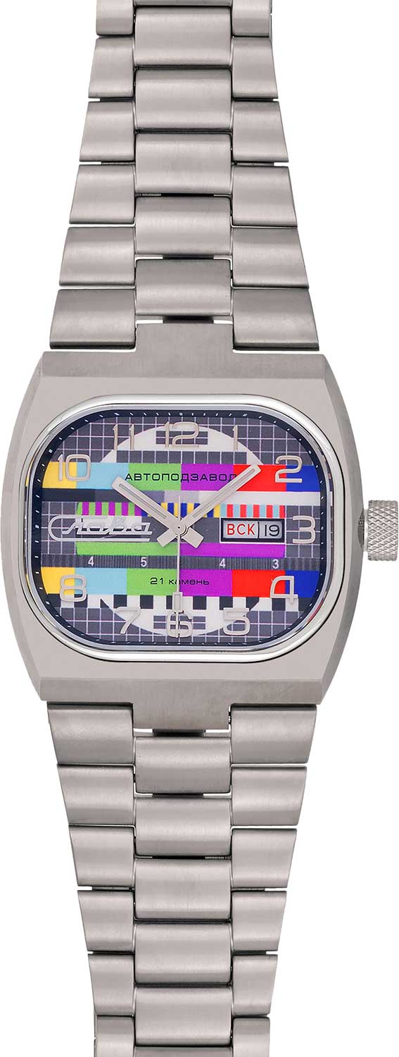 Циферблат с дизайном в виде TV экрана защищен прочным сапфировым стеклом. Метки в виде арабских цифр. Окошко даты и дня недели в положении 3 часа. Рифленая заводная головка. Надежный титановый браслет с раскладывающейся застежкой.