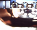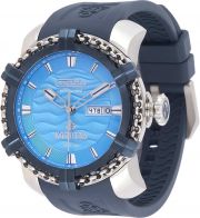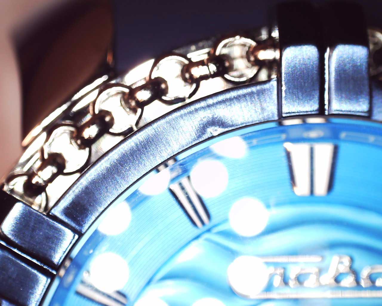 Механические часы с автоподзаводом. Круглый стальной корпус. Безель дополнен стальной цепочкой. Фактурный циферблат с поверхностью, имитирующей волны. Метки в виде штрихов. Окошко даты и дня недели находится в положении 3 часа.
