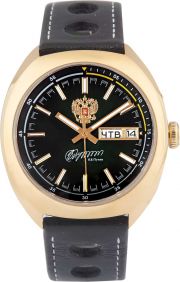 МИР. Лимитированная серия. Циферблат украшен гербом России и подписью Президента РФ. Окошко даты и дня недели находится в положении 3 часа. Метки в виде штрихов. Возможность ручного завода. Перфорированный ремешок с классической застежкой прошит белой нитью.