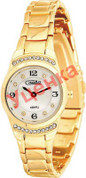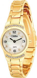 Женские часы в круглом корпусе. Циферблат и корпус украшены кристаллами. Браслет с раскладывающейся застежкой.