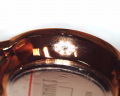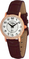 Циферблат с метками в виде арабских цифр. Круглый корпус. Безель украшен паве из кристаллов. Кожаный ремешок с классической застежкой.