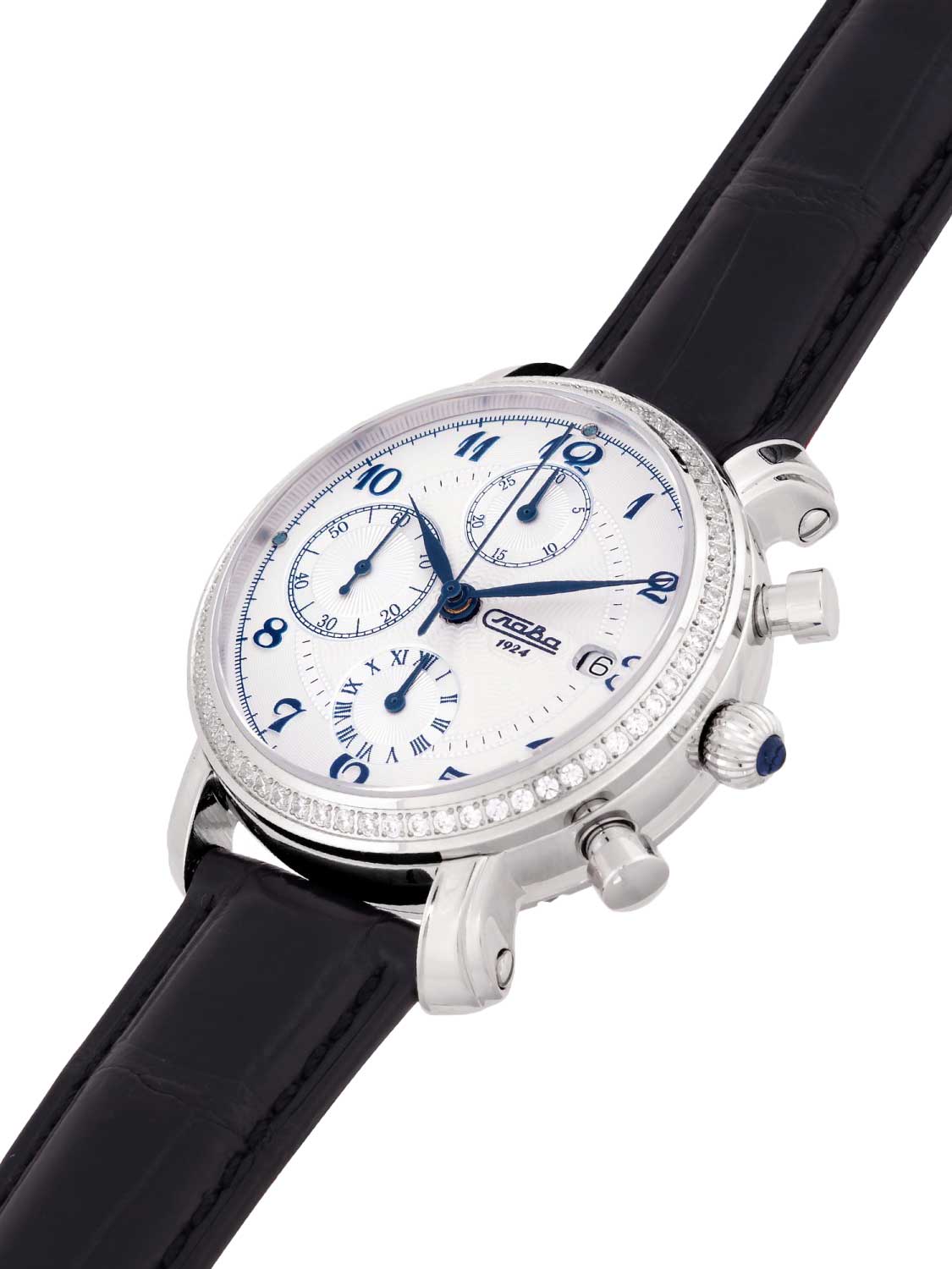 Циферблат с метками в виде арабских цифр защищен прочным сапфировым стеклом. Окошко даты находится в положении 3 часа. Заводная головка украшена камнем в форме кабошона.