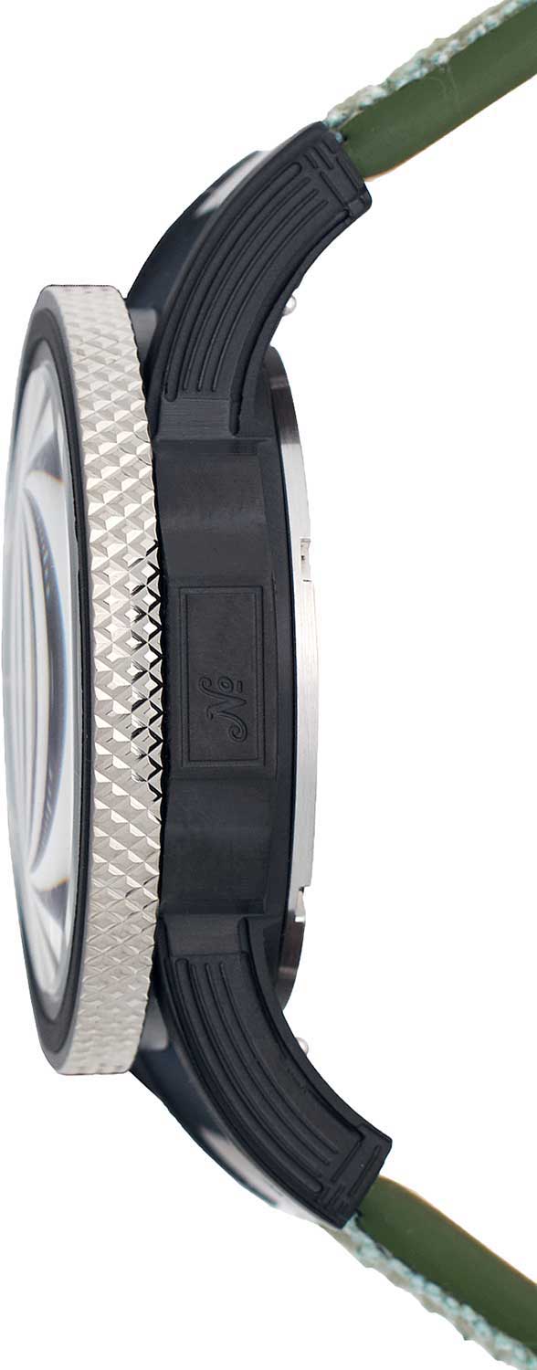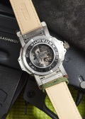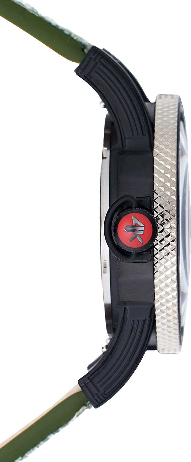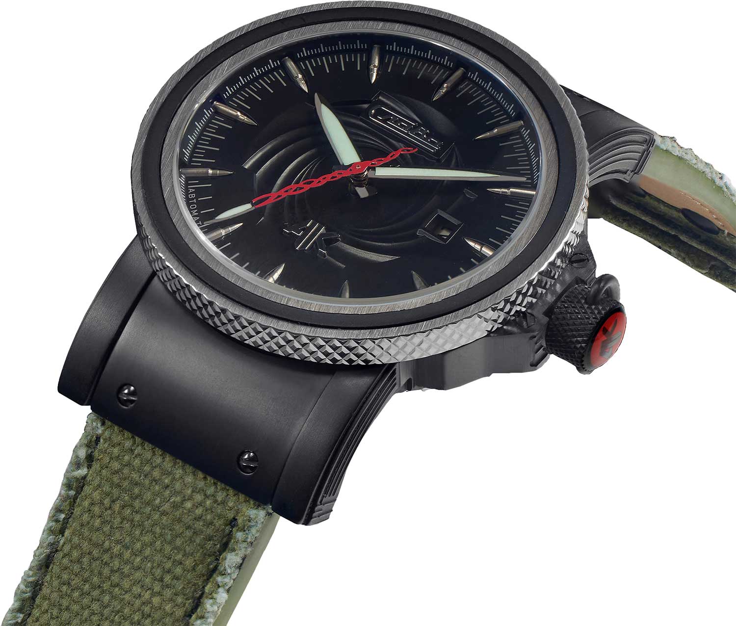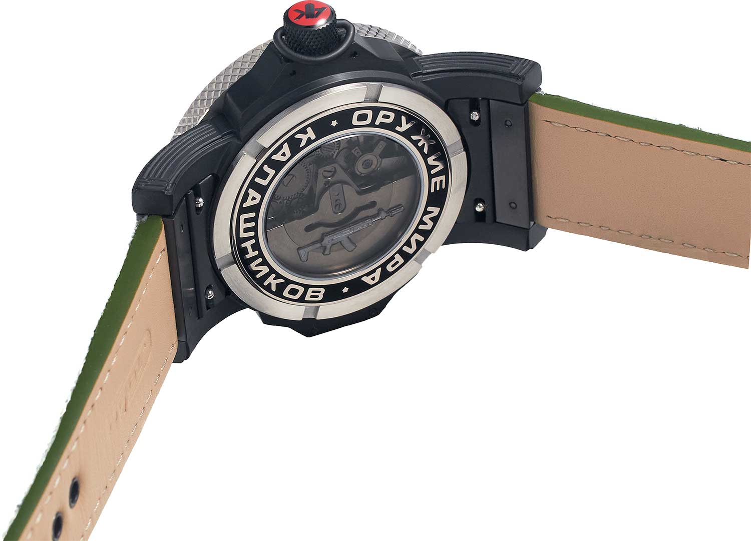 Титановое кольцо на безеле имитирует твердосплавное кольцо на срезе ствола автомата. Ушки часов стилизованы под магазин АКМ 7,62. Завинчивающаяся заводная головка с антабкой. Прозрачная задняя крышка с сапфировым стеклом. Ремешок с классической застежкой и системой быстрой замены.