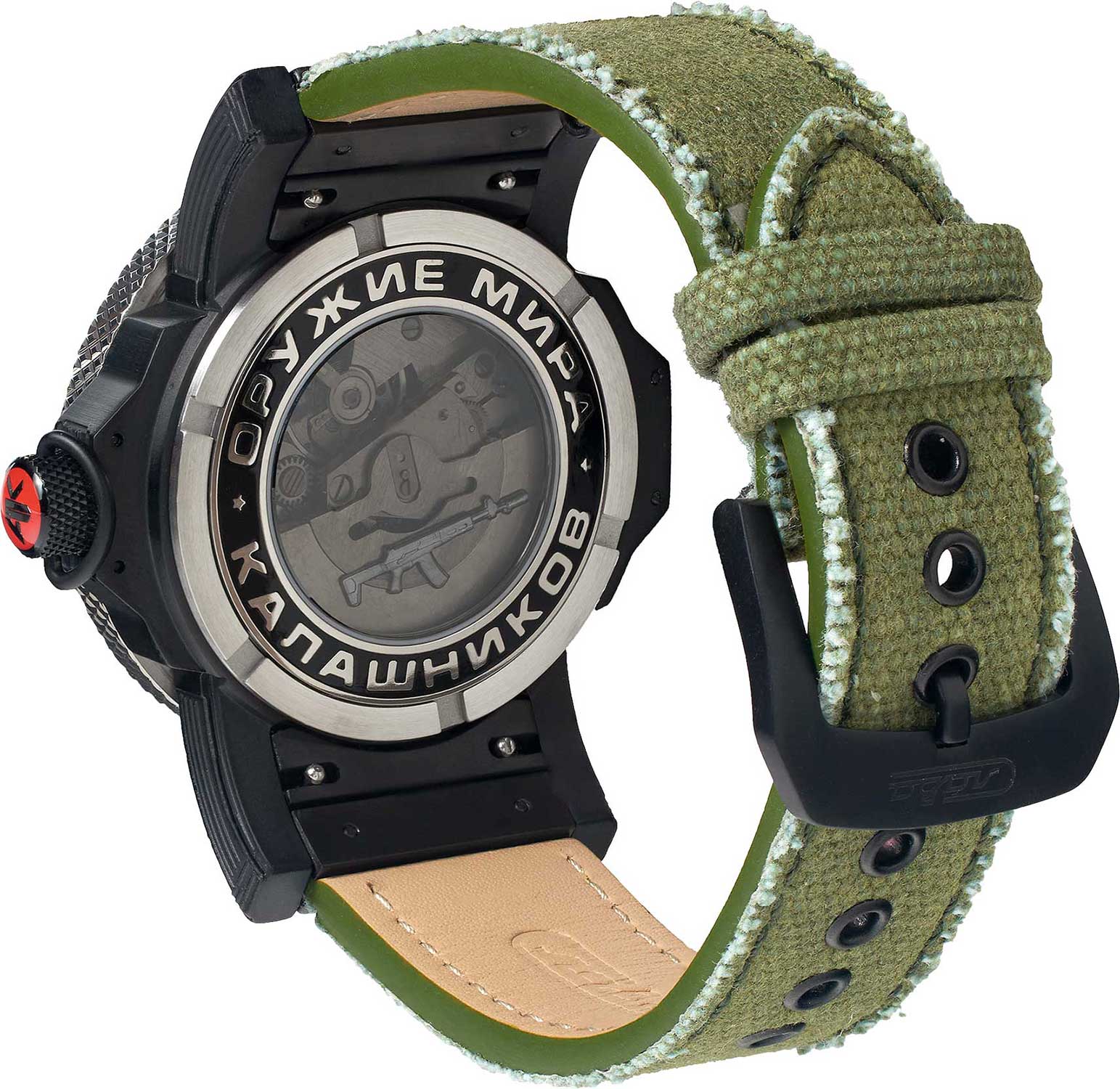В механизме 25 камней, частота 18000 полуколебаний в час. Запас хода 40 часов. Возможность ручного завода. Ротор механизма украшен объемным изображением автомата АК-12. Текстурный циферблат с имитацией дульного среза нарезного ствола. Метки в виде штрихов, выполненных в виде патронов. Минутная и часовая стрелки сделаны в виде штык-ножа, а секундная в виде летящей пули с пулевым следом. Окошко даты находится в положении 3 часа.