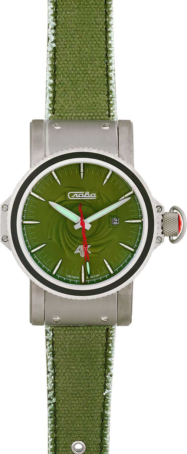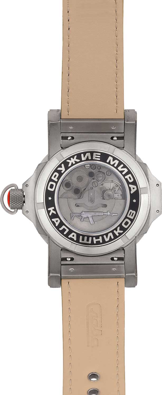 Титановое кольцо на безеле имитирует твердосплавное кольцо на срезе ствола автомата. Ушки часов стилизованы под магазин АКМ 7,62. Завинчивающаяся заводная головка с антабкой. Прозрачная задняя крышка с сапфировым стеклом. Ремешок с классической застежкой и системой быстрой замены.
