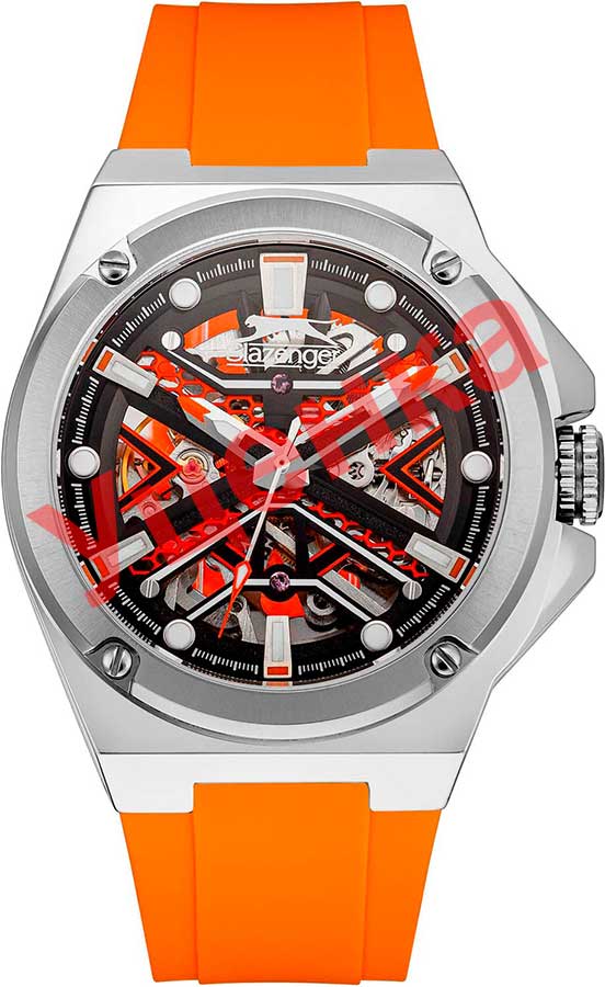 Скелетонизированные мужские механические часы с автоподзаводом. Круглый корпус из суперметалла. Сатинированный безель. Циферблат с метками в виде точек и штрихов защищен минеральным стеклом. Метки и стрелки с люминесцентным покрытием, которое светится в темноте после непродолжительной зарядки на свету. Заводная головка с защитой. На задней крышке имеется прозрачное окошко, через которое можно наблюдать работу механизма часов. Удобный силиконовый ремешок с классической застежкой.