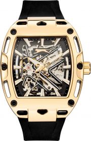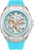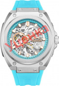 Скелетонизированные мужские механические часы. Бочкообразный корпус из суперметалла. Циферблат с логотипом бренда и метками в виде штрихов защищен минеральным стеклом. Метки и стрелки с люминесцентным покрытием, которое светится в темноте после непродолжительной зарядки на свету. Прозрачная задняя крышка. Рифленая заводная головка с защитой. Удобный силиконовый ремешок с классической застежкой.