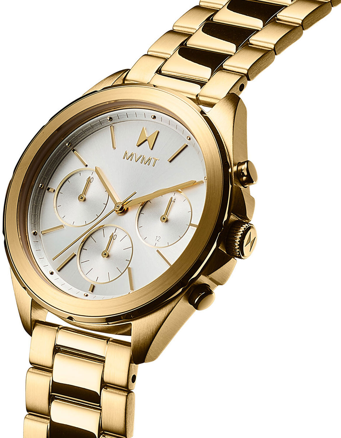 стеклом и украшен радиальным брашированием поверхности. Заостренные прямоугольные стрелки. Метки в виде штрихов, 12-ти часовая метка в виде фирменного логотипа MVMT. Рифленая заводная головка с защитой и застежка украшены фирменным логотипом. Завинчивающаяся задняя крышка. Надежный стальной браслет с раскладывающейся застежкой. Застежка с системой блокировки.