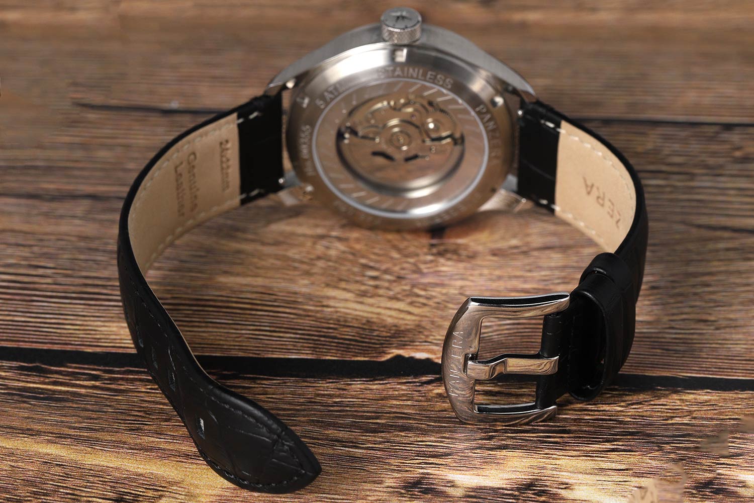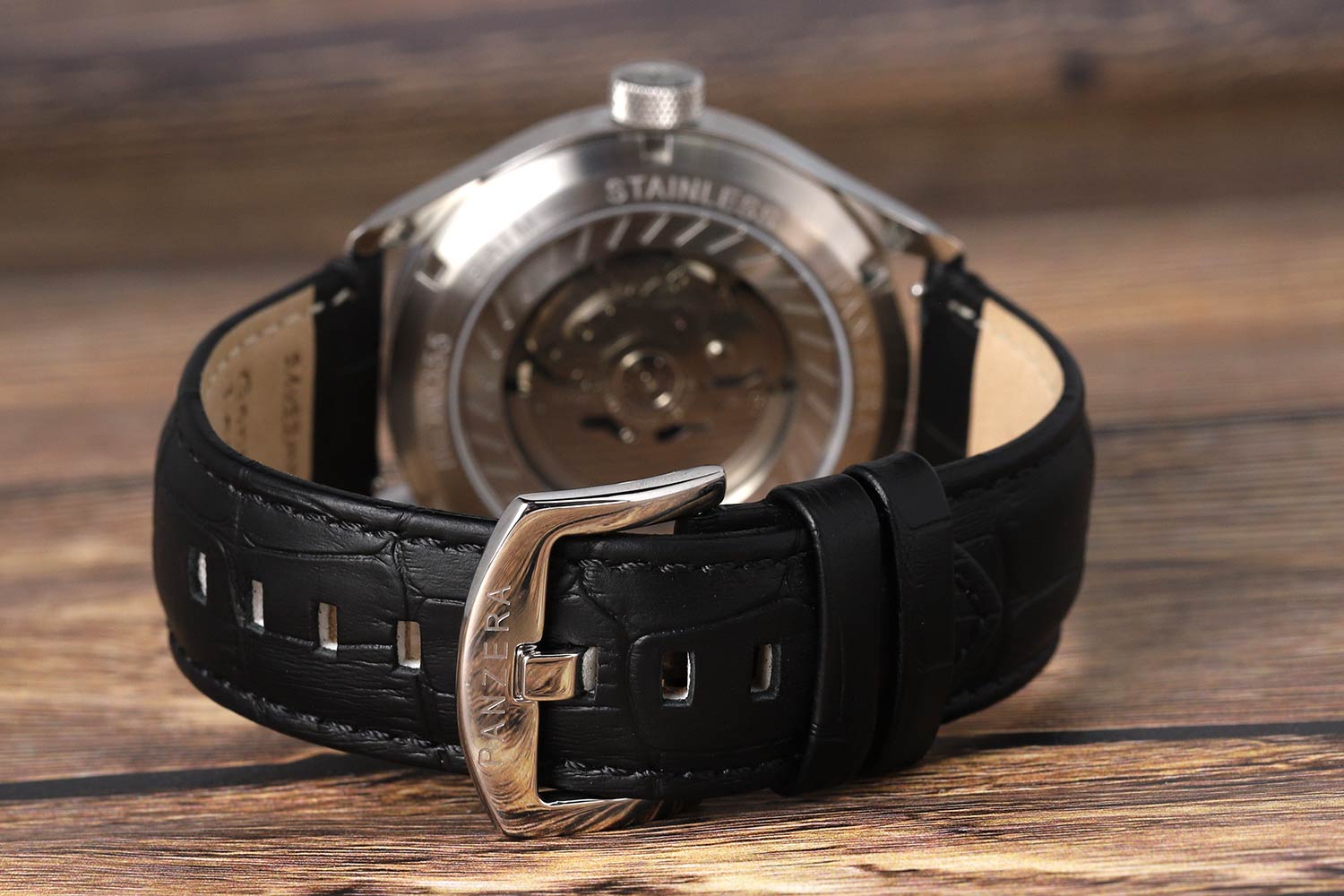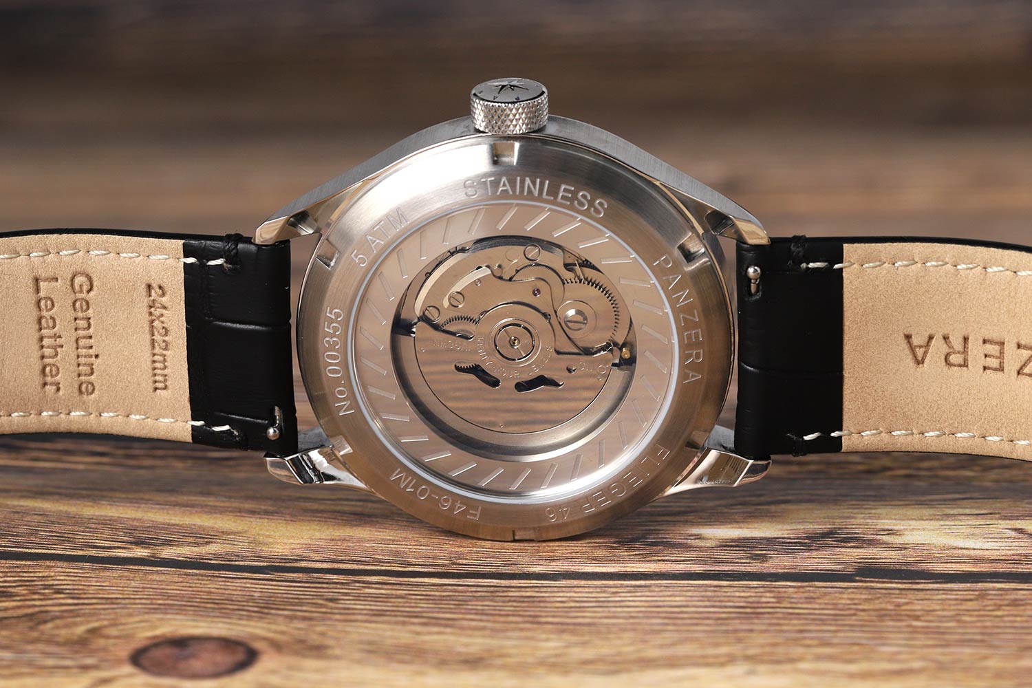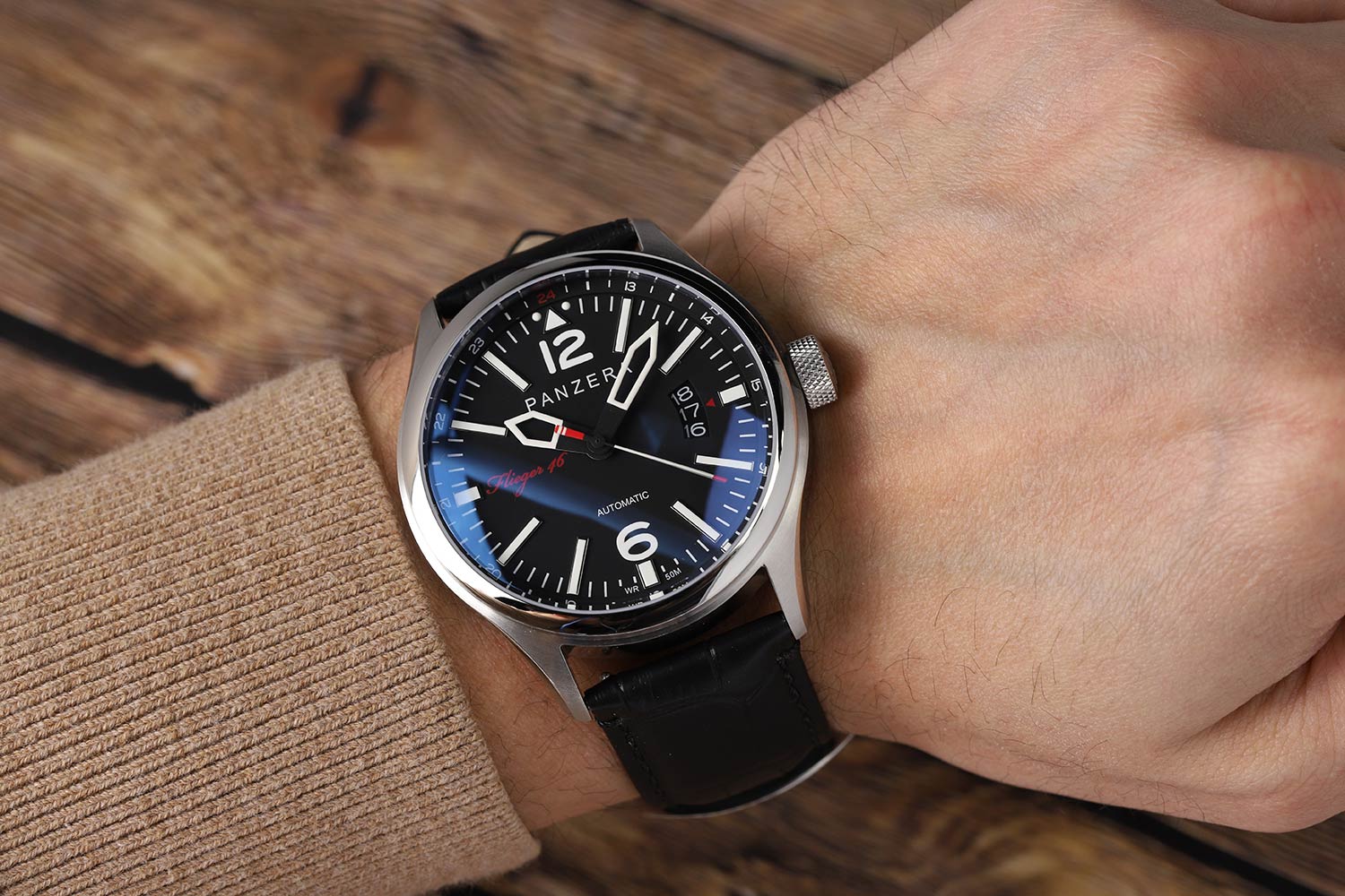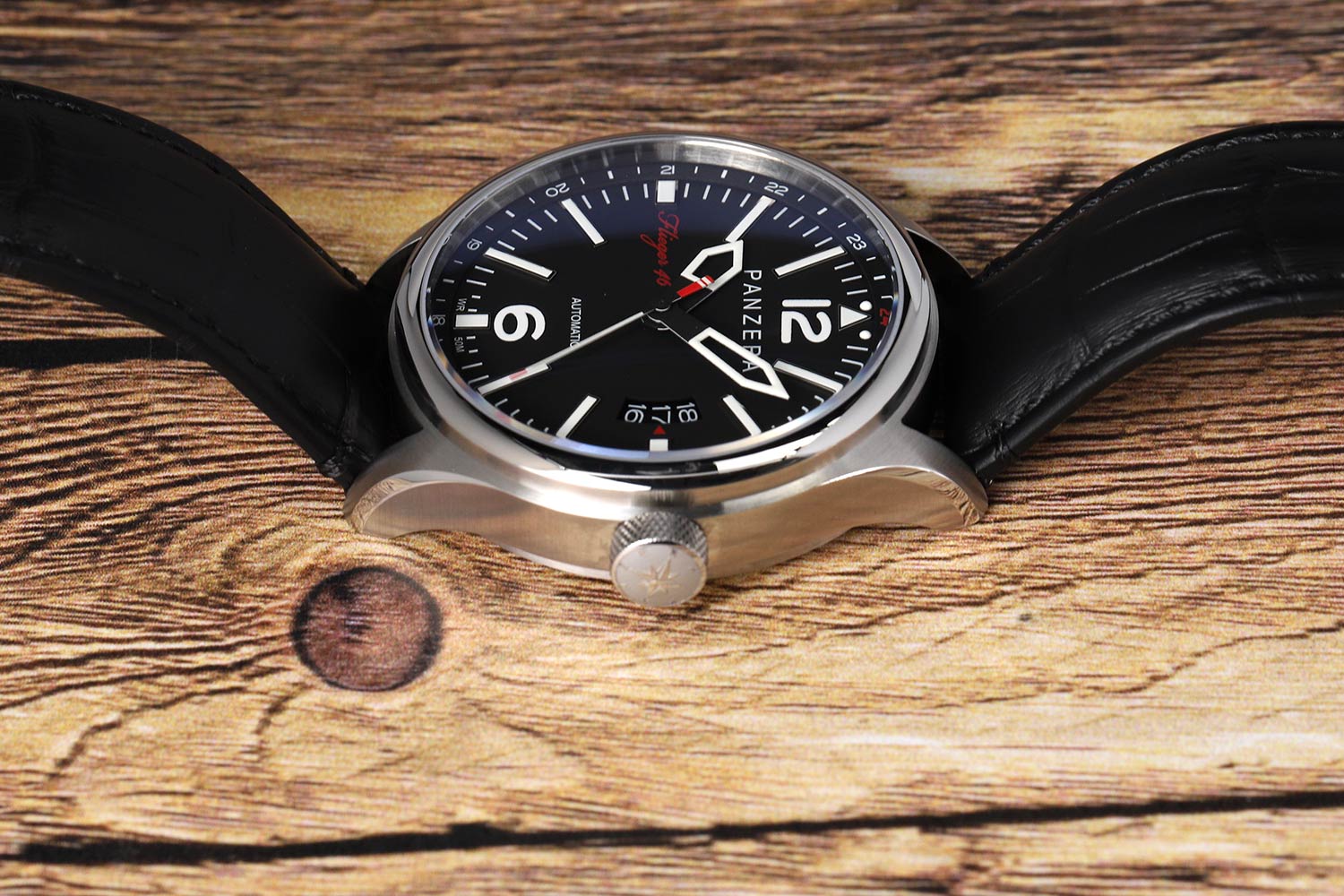 Практичные часы с хорошо читаемым циферблатом - идеальный вариант для мужчин, которые не представляют свою жизнь без неба и полетов. Flieger 46 Hornet Spirt. В механизме 24 камня. Запас хода 41 час. 12-ти и 24-х часовой формат времени. Метки в виде штрихов. Окошко даты. Дизайн стрелок вдохновлен лопастями пропеллера, которые использовали в самолетах прошлых лет. Завинчивающаяся задняя крышка со стеклом напоминает турбину современного самолета. Завинчивающаяся заводная головка. Ремешок с классической застежкой и системой быстрой замены.