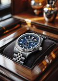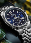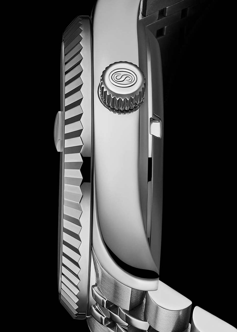 Окошко даты с увеличительным стеклом находится в положении 3 часа. Дни недели вынесены на отдельный циферблат. На задней крышке имеется прозрачное окошко, через которое можно наблюдать работу механизма часов. Рифленая заводная головка. Надежный стальной браслет с раскладывающейся застежкой.