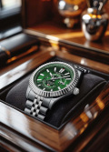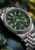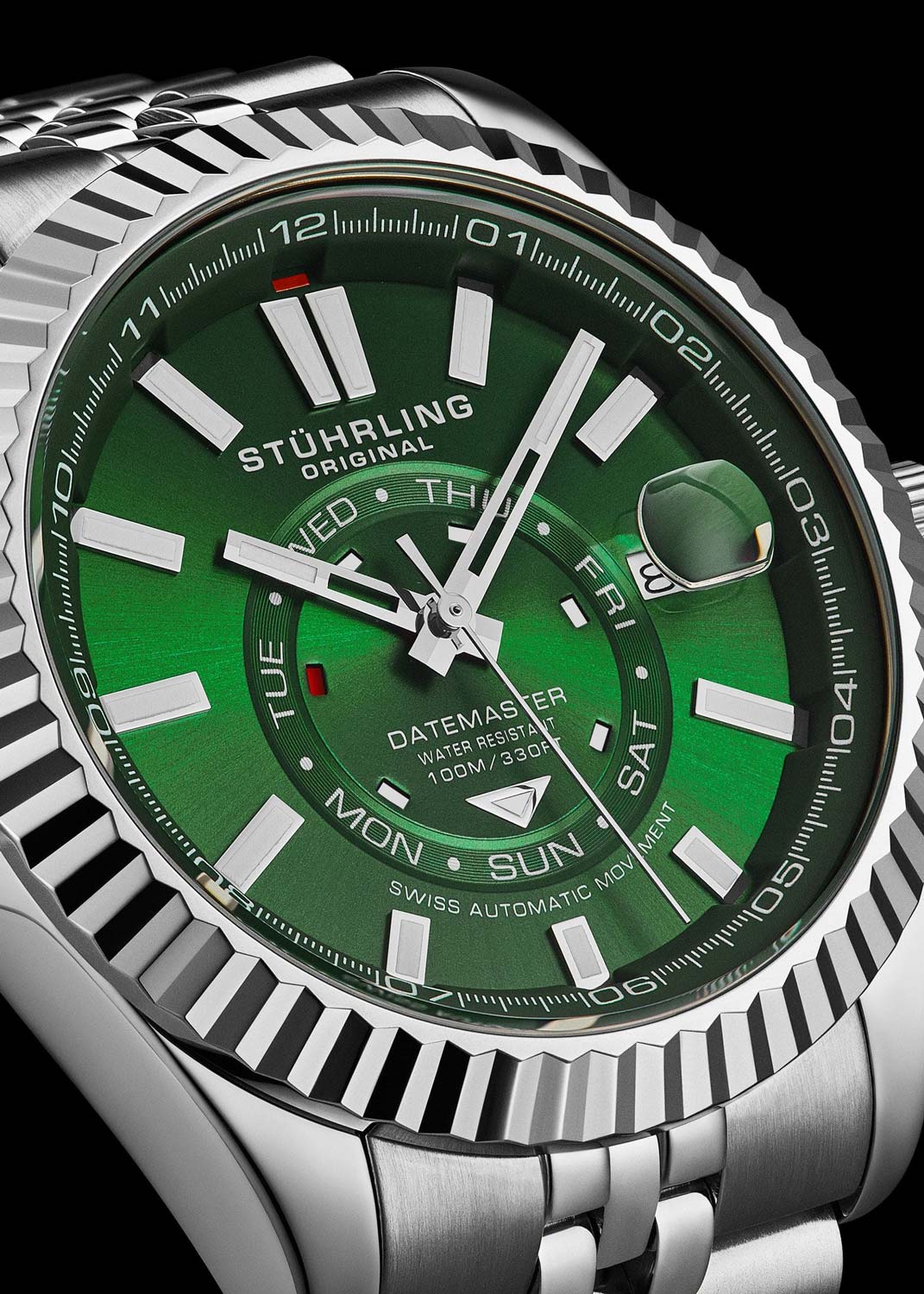 Окошко даты с увеличительным стеклом находится в положении 3 часа. Дни недели вынесены на отдельный циферблат. На задней крышке имеется прозрачное окошко, через которое можно наблюдать работу механизма часов. Рифленая заводная головка. Надежный стальной браслет с раскладывающейся застежкой.