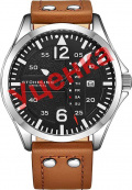 Aviator. Мужские часы. Метки в виде штрихов и двух арабских цифр. Окошко даты и индикатор дня недели. Завинчивающаяся задняя крышка украшена гравировкой. Заводная головка с защитой. Ремешок с классической застежкой.