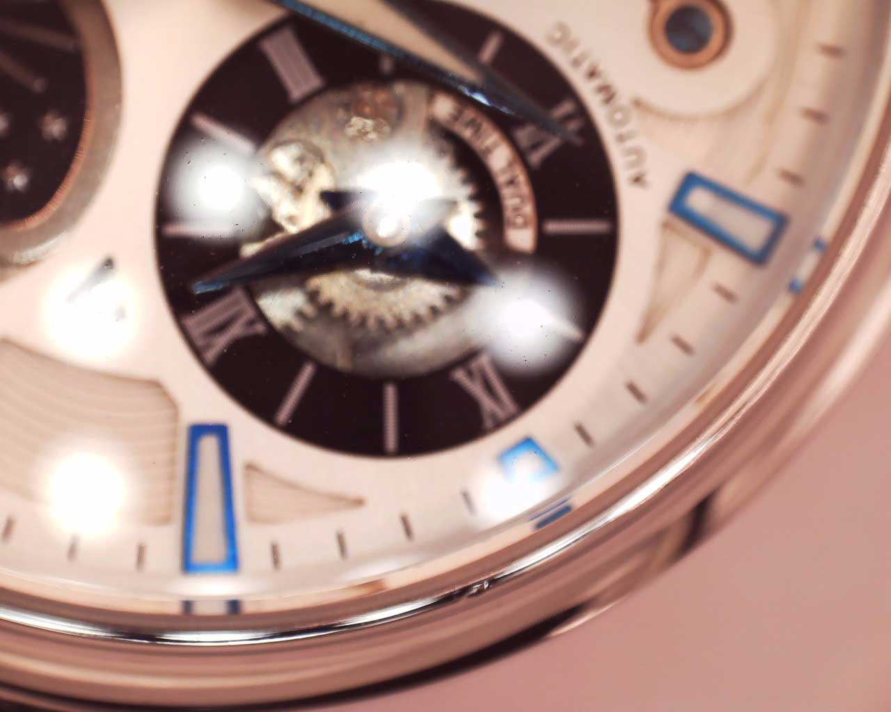 Special Reserve. Мужские часы. В механизме 22 камня. Второй часовой пояс. Индикатор день/ночь. Сквозь прозрачное окошко на циферблате можно наблюдать за работой механизма часов. Накладные метки в виде штрихов. Завинчивающаяся задняя крышка со стеклом Krysterna. Ремешок с классической застежкой.