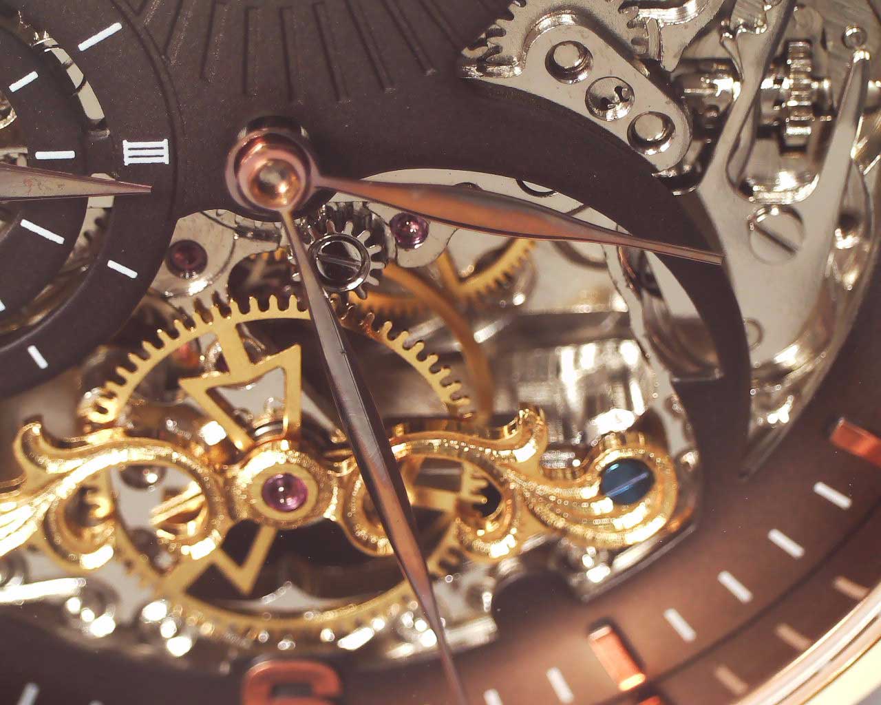 Special Reserve. Скелетонизированные часы. В механизме 22 камня. Второй часовой пояс. Индикатор день/ночь. Накладные метки в виде штрихов и арабских цифр. Завинчивающаяся задняя крышка со стеклом Krysterna. Заводная головка украшена камнем в форме кабошона. Ремешок с классической застежкой.