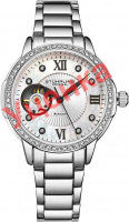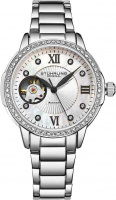 Perle. Сквозь прозрачное окошко на циферблате можно наблюдать за работой механизма часов. Накладные метки в виде точек и римских цифр. Завинчивающаяся задняя крышка со стеклом Krysterna. Рифленая заводная головка. Браслет с раскладывающейся застежкой.