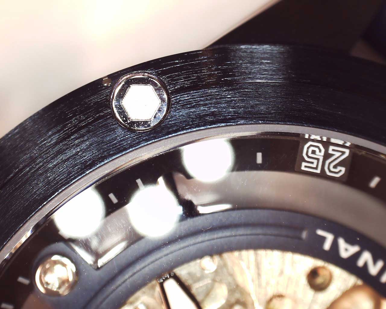 Скелетонизированные часы Grandiose. Прозрачная задняя крышка со стеклом Krysterna крепится на 6-ти винтах. Рифленая заводная головка. Силиконовый ремешок.