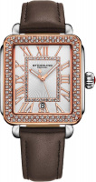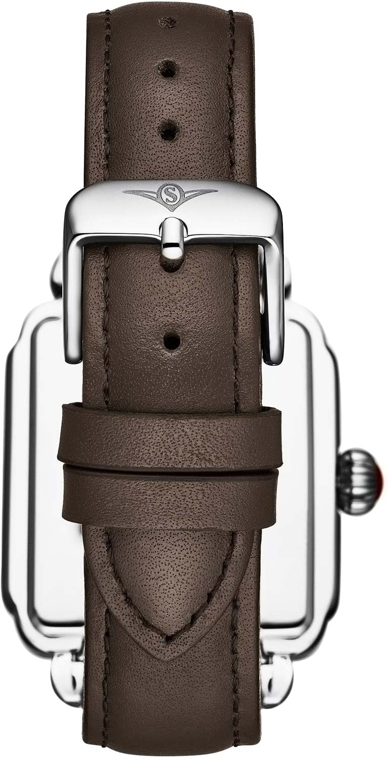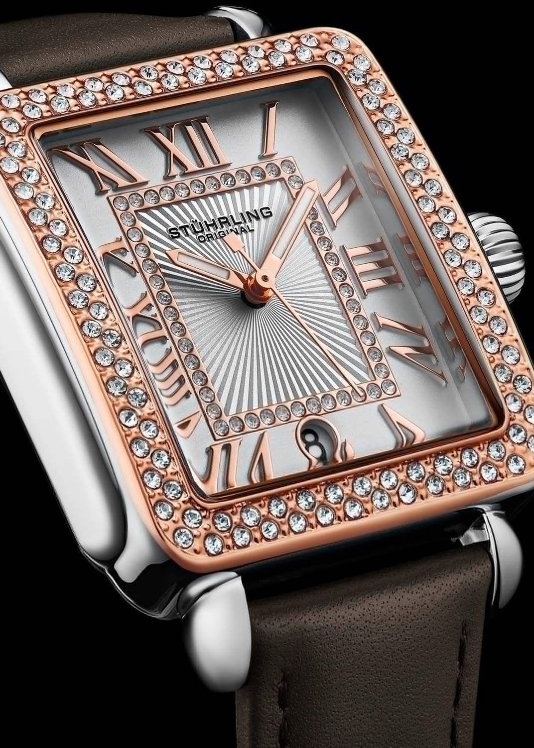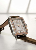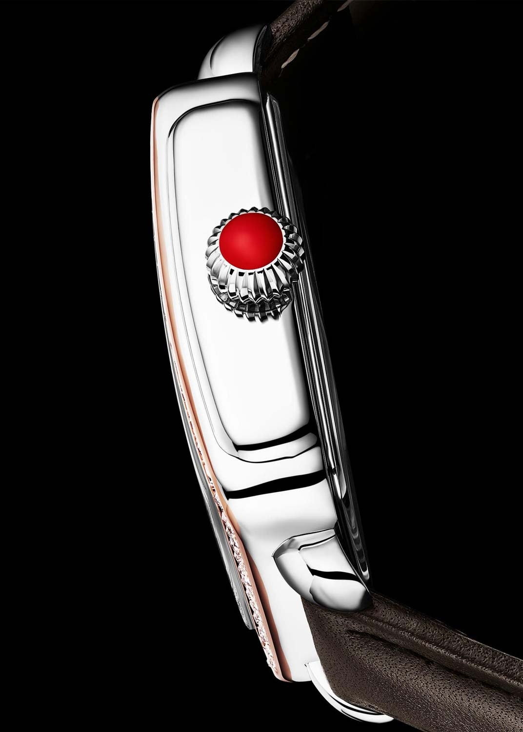 Прямоугольные стрелки в стиле Baton с люминесцентным покрытием, которое светится в темноте после непродолжительной зарядки на свету. Окошко даты находится в положении 6 часов. Рифленая заводная головка в форме луковицы украшена красной эмалью. Удобный кожаный ремешок с классической застежкой.