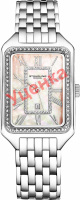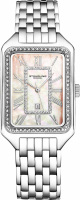 Кварцевые наручные женские часы. Прямоугольный полированный корпус инкрустирован кристаллами. Перламутровый циферблат с центральной частью, выделенной кристаллами, украшен логотипом бренда.