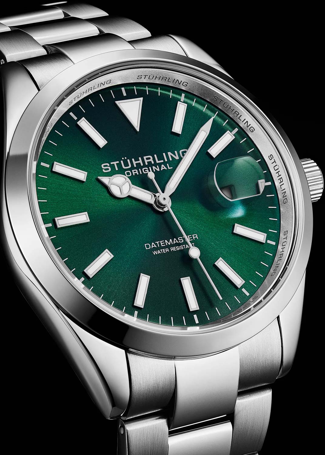 Метки и стрелки с люминесцентным покрытием, которое светится в темноте после непродолжительной зарядки на свету. Рифленая заводная головка. Надежный стальной браслет с раскладывающейся застежкой.