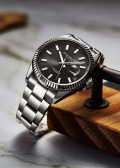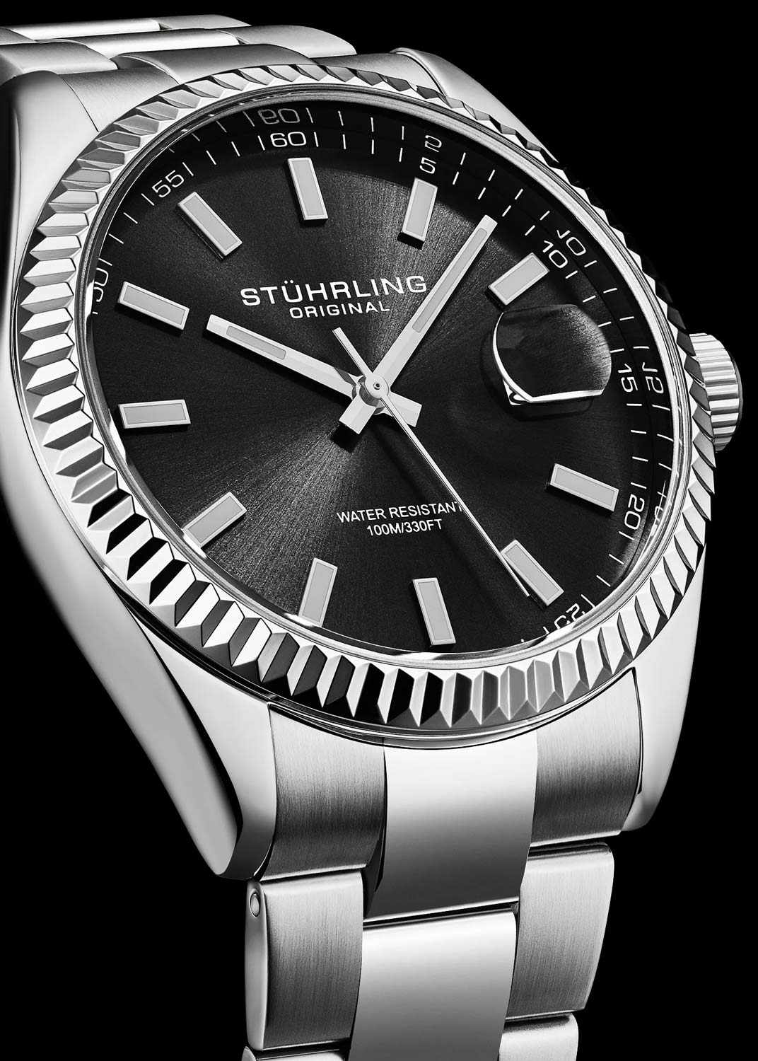 Метки и стрелки с люминесцентным покрытием, которое светится в темноте после непродолжительной зарядки на свету. Рифленая заводная головка. Надежный стальной браслет с раскладывающейся застежкой.
