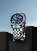 Дата и день недели вынесены на отдельные циферблаты. Рифленая заводная головка. Надежный стальной браслет с раскладывающейся застежкой.