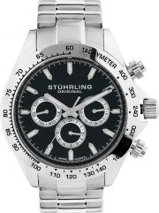 Raceway. Часы с тахиметром. 12-ти и 24-х часовой формат времени, число и день недели вынесены на отдельные циферблаты. Накладные метки в виде штрихов. Завинчивающаяся заводная головка с защитой. Завинчивающаяся задняя крышка украшена гравировкой Stuhrling. Браслет с раскладывающейся застежкой. Застежка с системой блокировки.