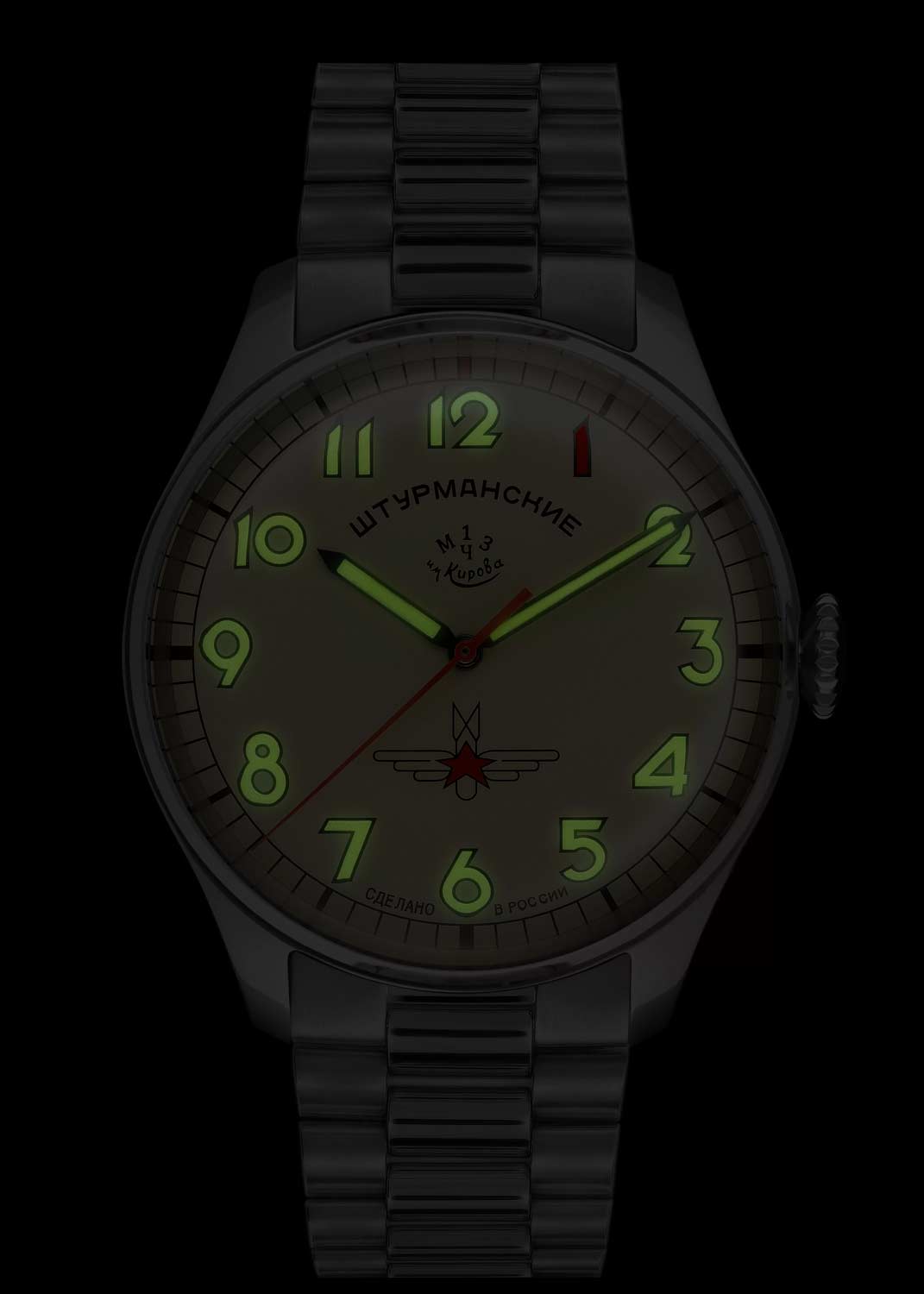 Циферблат с крупными метками в виде арабских цифр. Заостренные прямоугольные стрелки в стиле Baton. Стрелки и метки с люминесцентным покрытием SuperLuminova, которое светится в темноте после непродолжительной зарядки на свету.
