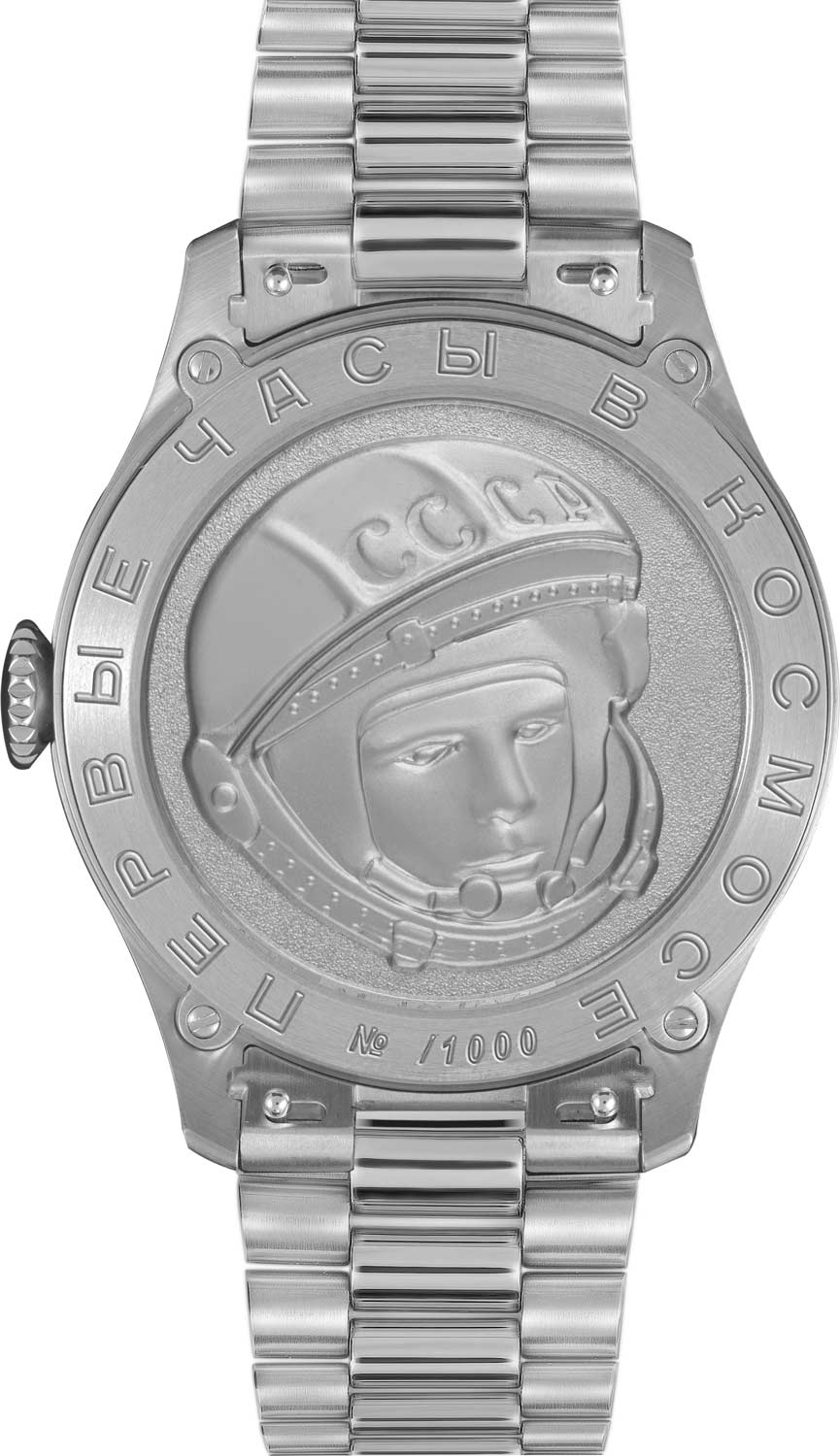 Рифленая заводная головка. Стальная задняя крышка с изображением Юрия Гагарина и надписью «Первые часы в космосе» крепится на 4-х винтах. Браслет с раскладывающейся застежкой.