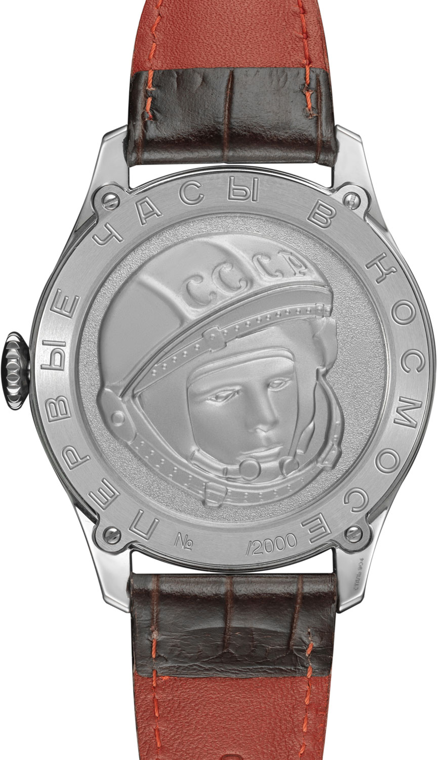Рифленая заводная головка. Стальная задняя крышка крепится на 4-х винтах. На ней выполнена гравировка с изображением Юрия Гагарина и надписью «Первые часы в космосе». Кожаный ремешок с классической застежкой.