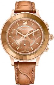 Женские часы-хронограф с секундомером Octea Lux Chrono. Стальной круглый корпус с розовым PVD покрытием. Ограненный кристальный безель. Циферблат выполнен по технологии Sunray (солнечные лучи), украшен кристаллами и изображением лебедя Swarovski в положении 12 часов. Метки в виде штрихов. Рифленая заводная головка. Ремешок из натуральной телячьей кожи коричневого цвета с классической застежкой.