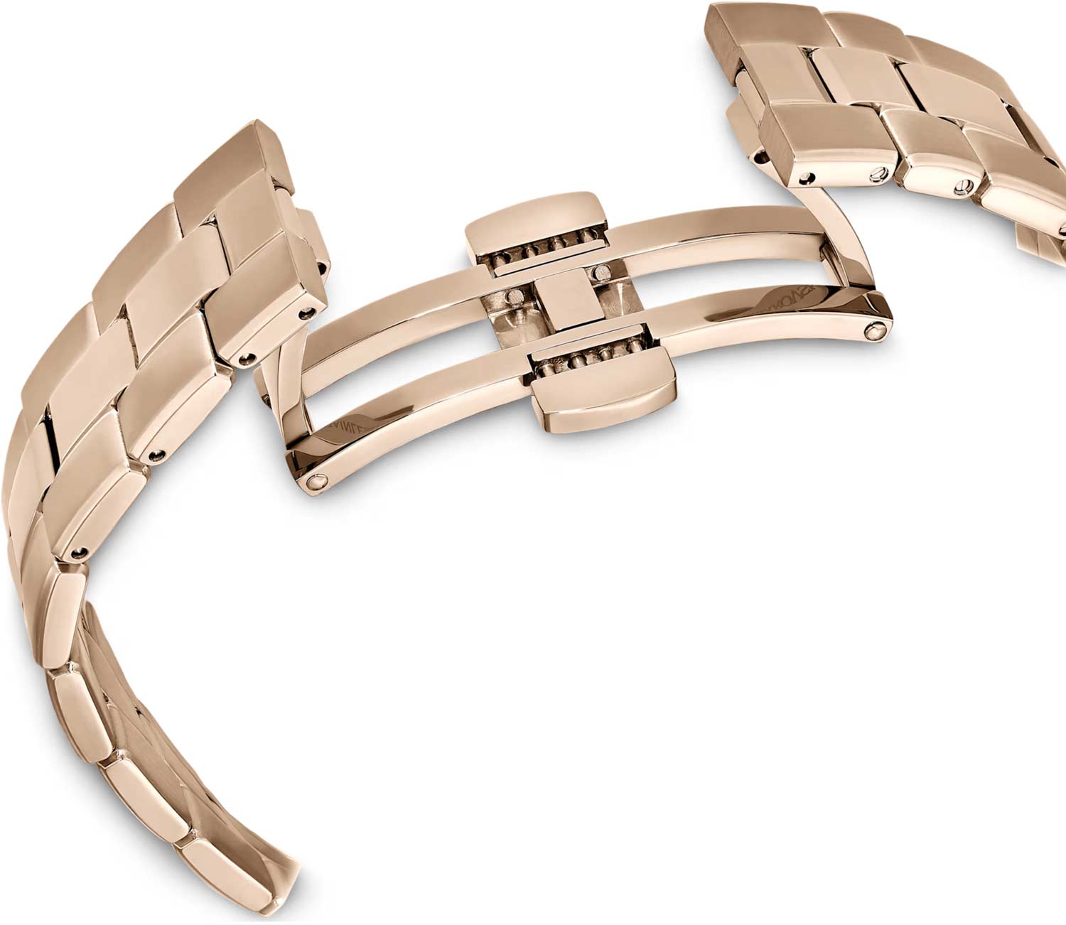 Метки в виде штрихов и точек, украшенных кристаллами Swarovski. Рифленая заводная головка. Стальной браслет с раскладывающейся застежкой.