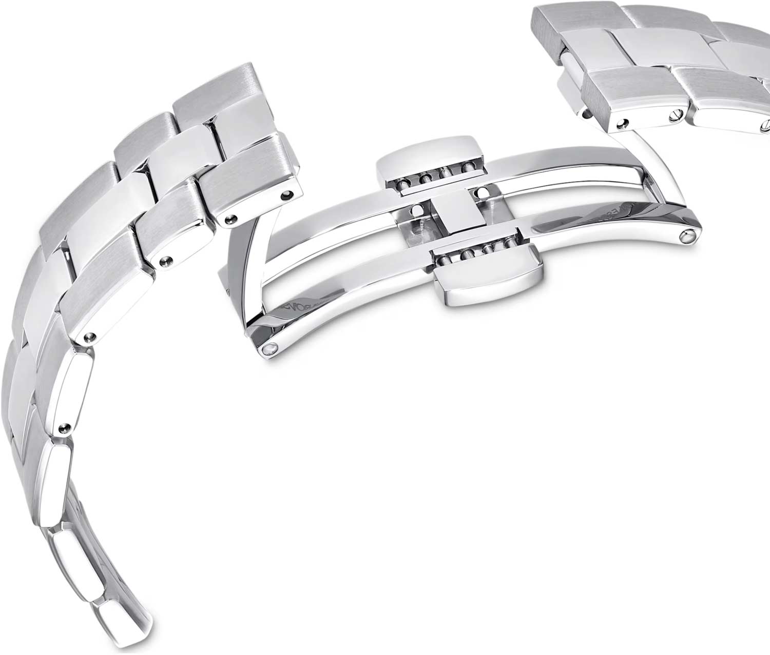 Метки в виде штрихов и точек, украшенных кристаллами Swarovski. Рифленая заводная головка. Стальной браслет с раскладывающейся застежкой.