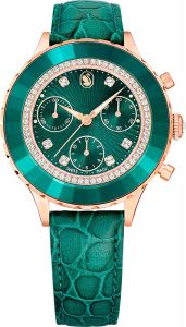 Женские часы-хронограф с секундомером. Стальной круглый корпус с PVD покрытием оттенка розового золота эффектно сочетается с ограненным кристальным безелем красивого изумрудного цвета, окруженным сверкающими кристаллами Swarovski. Под минеральным стеклом открывается завораживающий гильошированный циферблат с логотипом Swarovski в виде лебедя в положении 12 часов и метками, представленными точками, шесть из которых оформлены кристаллами круглой огранки, придавая циферблату особое очарование и блеск. Три счетчика хронографа предназначены для отдельного измерения часов, минут и секунд. Стрелки с люминесцентным покрытием LumiNova, которое светится в темноте после непродолжительной зарядки на свету. Рифленая заводная головка украшена сверкающим кристаллом круглой огранки. Ремешок из натуральной итальянской телячьей кожи зеленого цвета с тиснением под кожу крокодила. Классическая застежка.
