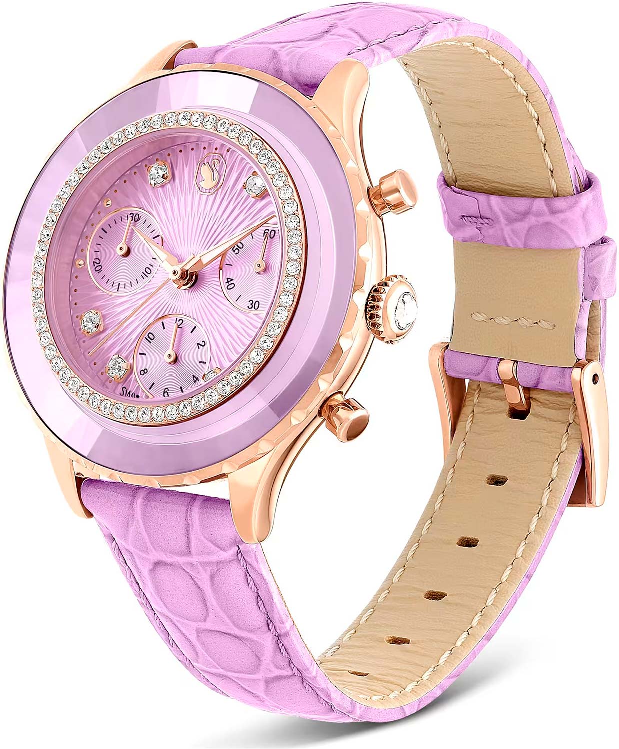 покрытием оттенка розового золота эффектно сочетается с ограненным кристальным безелем фиолетового цвета, окруженным сверкающими кристаллами Swarovski. Под минеральным