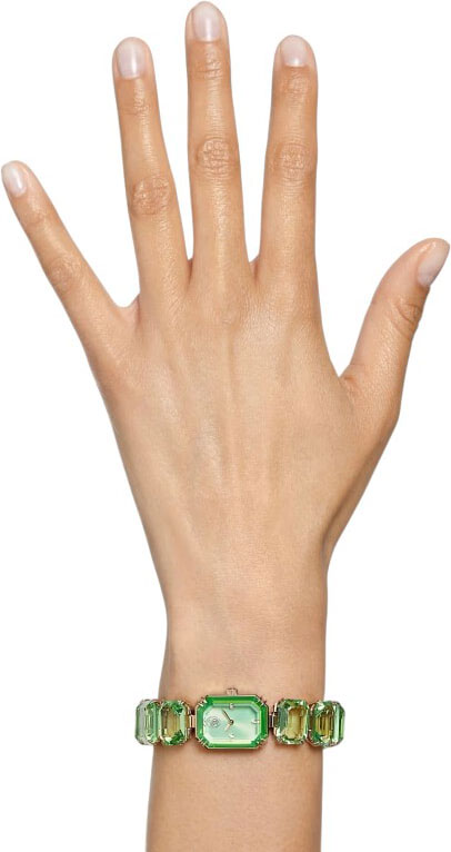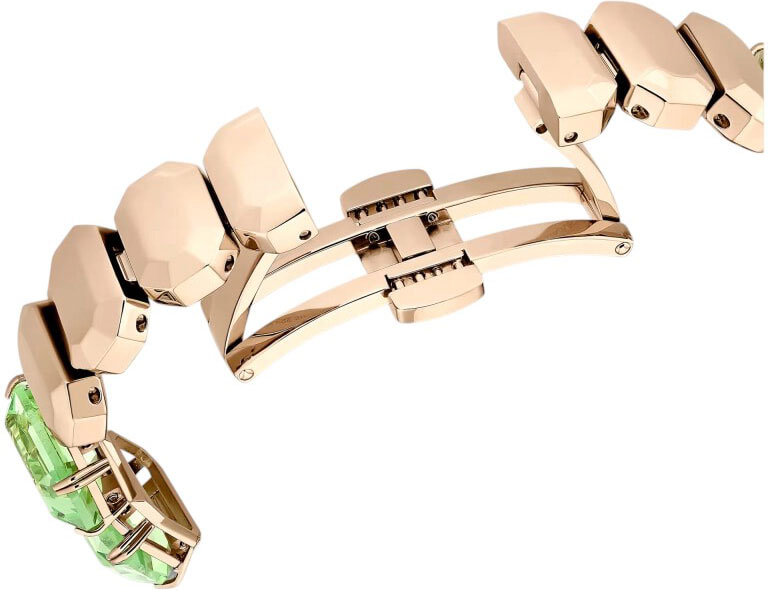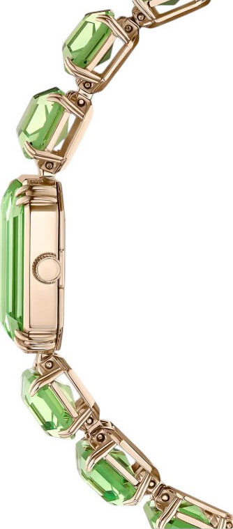 Рифленая заводная головка. Стальной браслет с застежкой-бабочкой декорирован рядом крупных зеленых кристаллов Swarovski огранки октагон.