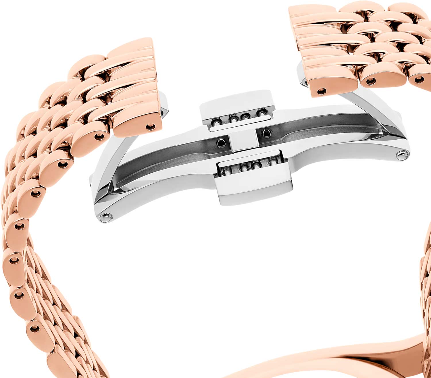 Клиновидные стрелки в стиле Dauphine. Секундная стрелка отсутствует. Рифленая заводная головка. Стальной браслет с PVD покрытием оттенка розового золота и застежкой-бабочкой.
