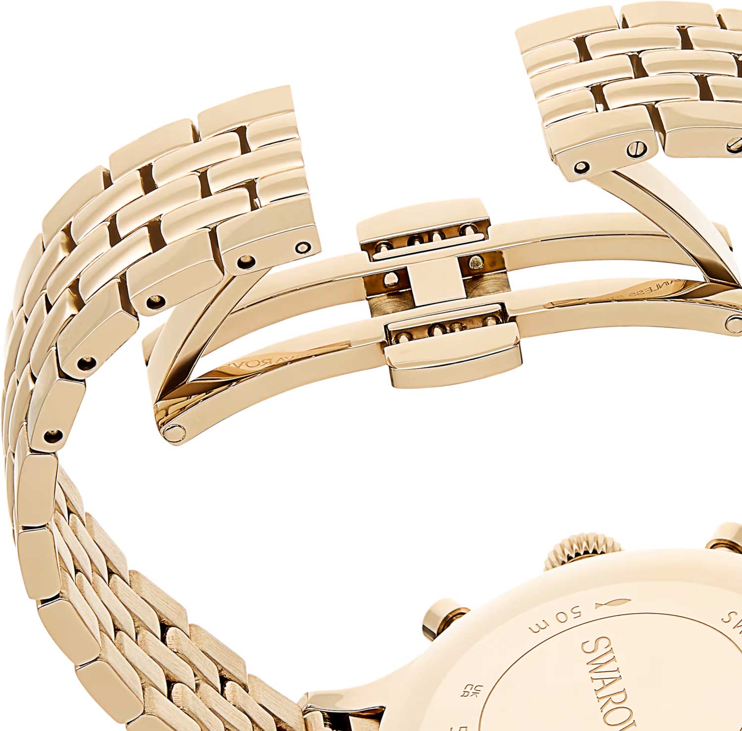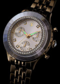 Суженые стрелки в стиле Alpha с люминесцентным покрытием LumiNova, которое светится в темноте после непродолжительной зарядки на свету. Рифленая заводная головка украшена кристаллом круглой огранки. Стальной браслет с PVD покрытием оттенка шампань и застежкой-бабочкой.