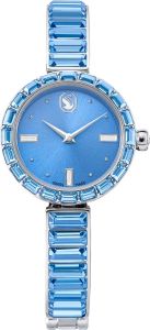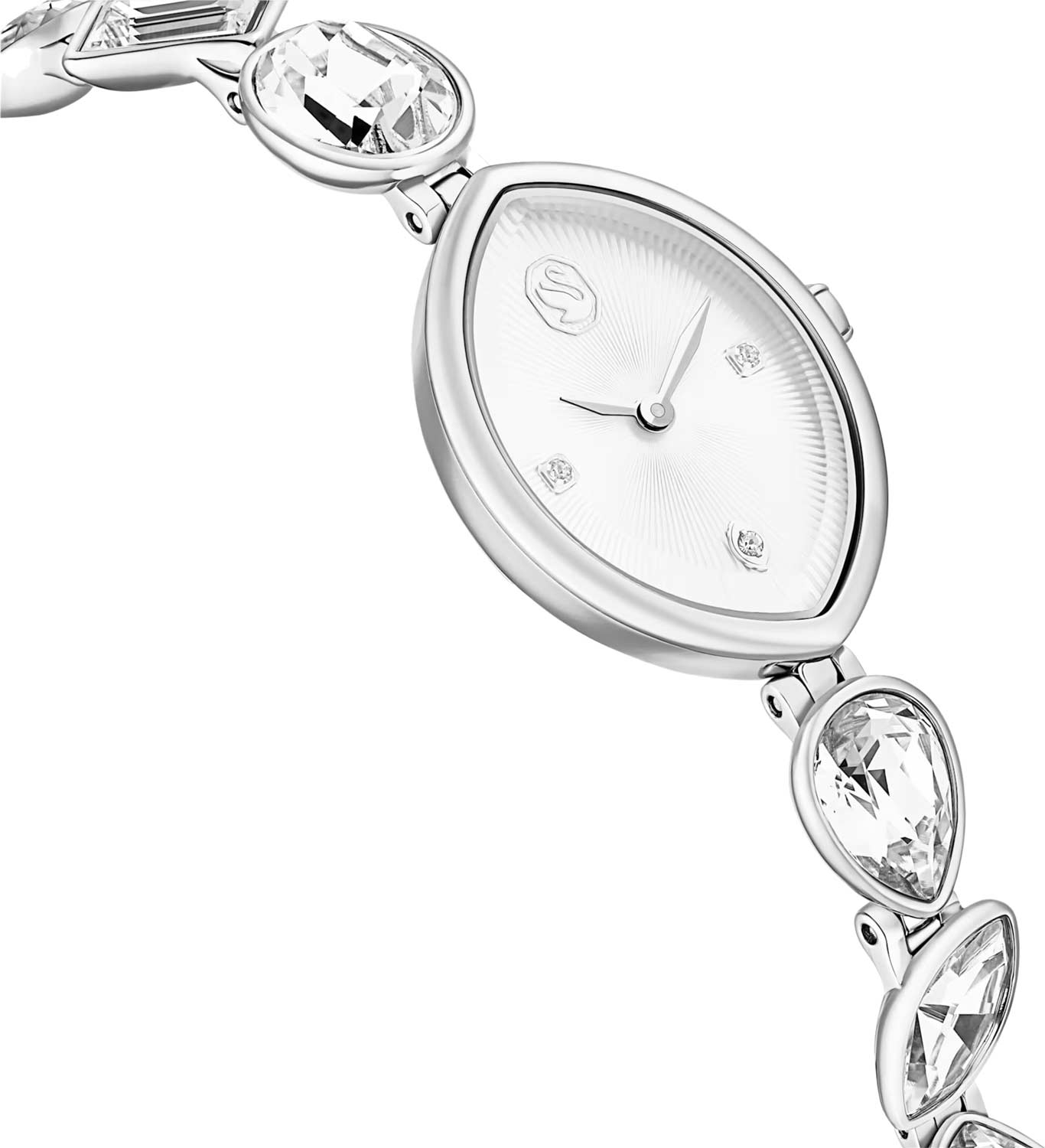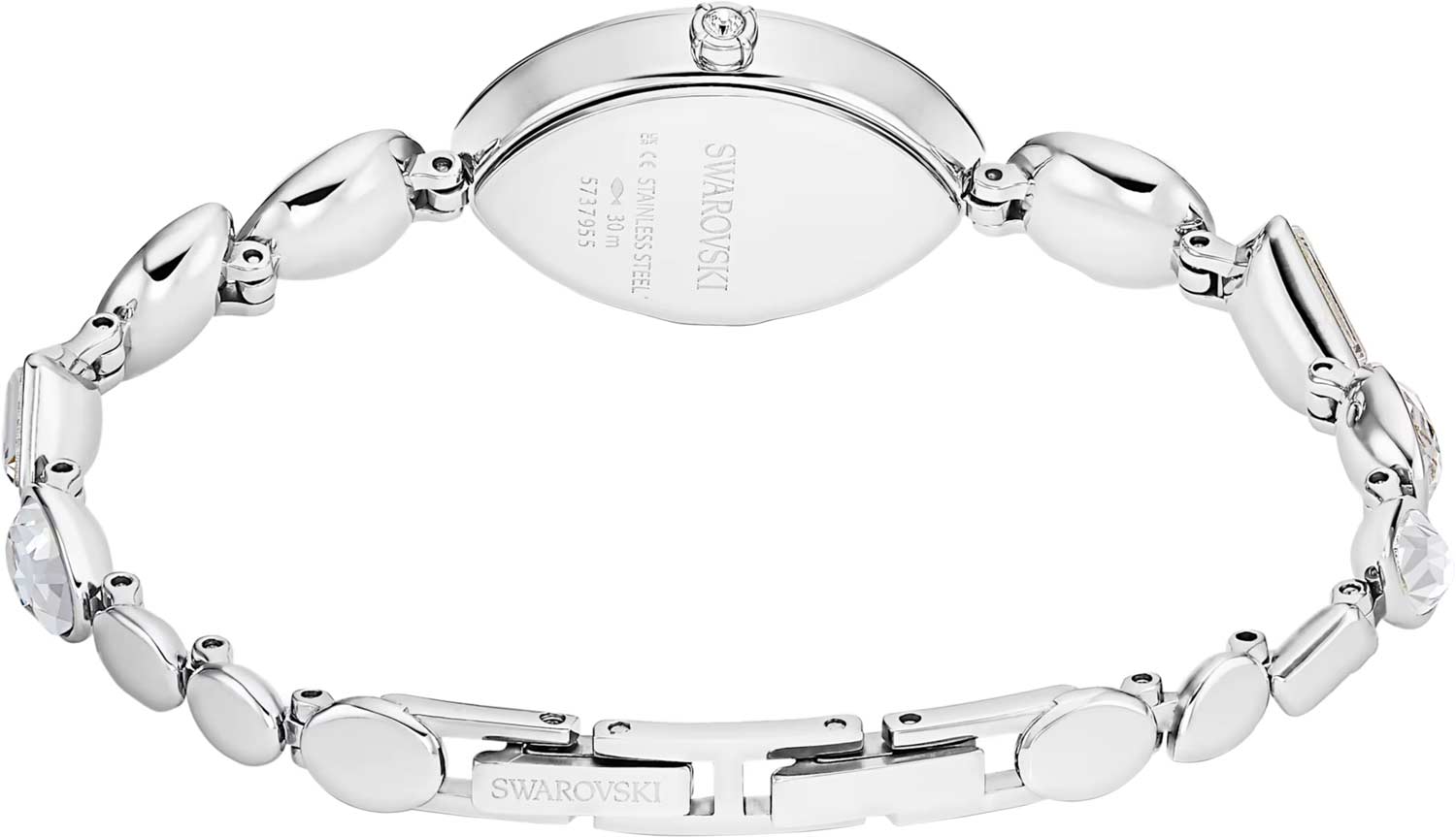 Заводная головка украшена кристаллом круглой огранки. Стальной регулируемый браслет дополнен 8 кристаллами разной огранки. Ювелирная застежка с логотипом Swarovski.