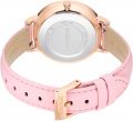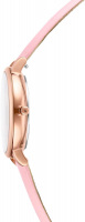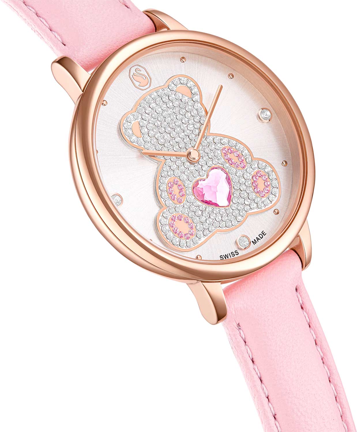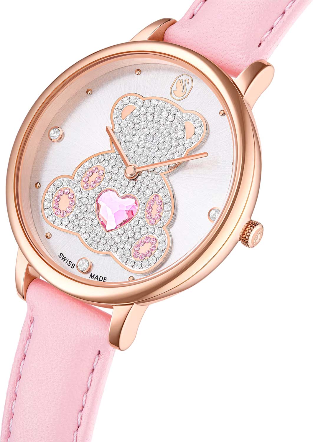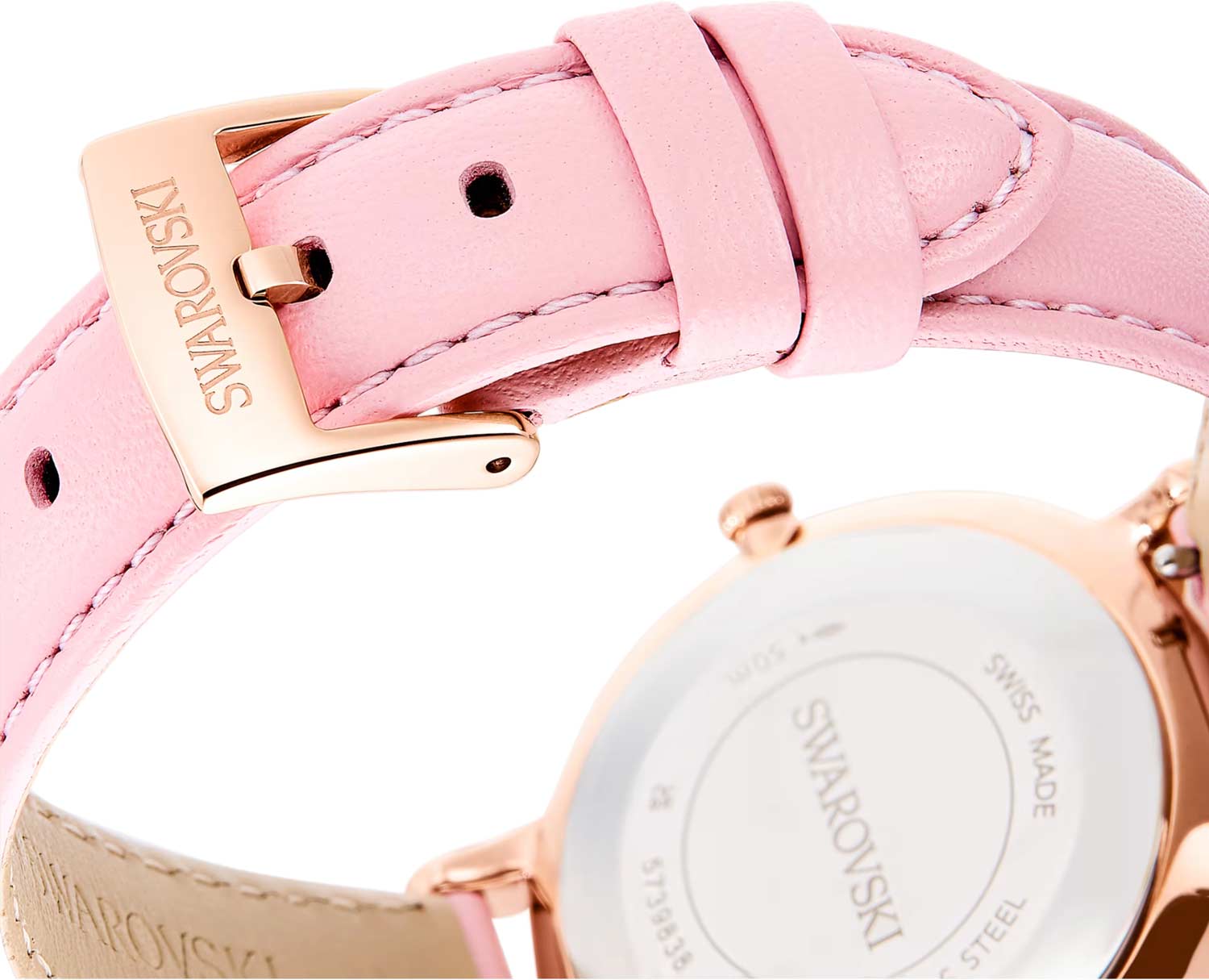 Заостренные узкие прямоугольные стрелки в стиле Baton. Секундная стрелка отсутствует. Рифленая заводная головка. Ремешок из натуральной итальянской телячьей кожи розового цвета. Классическая застежка с логотипом Swarovski.