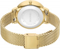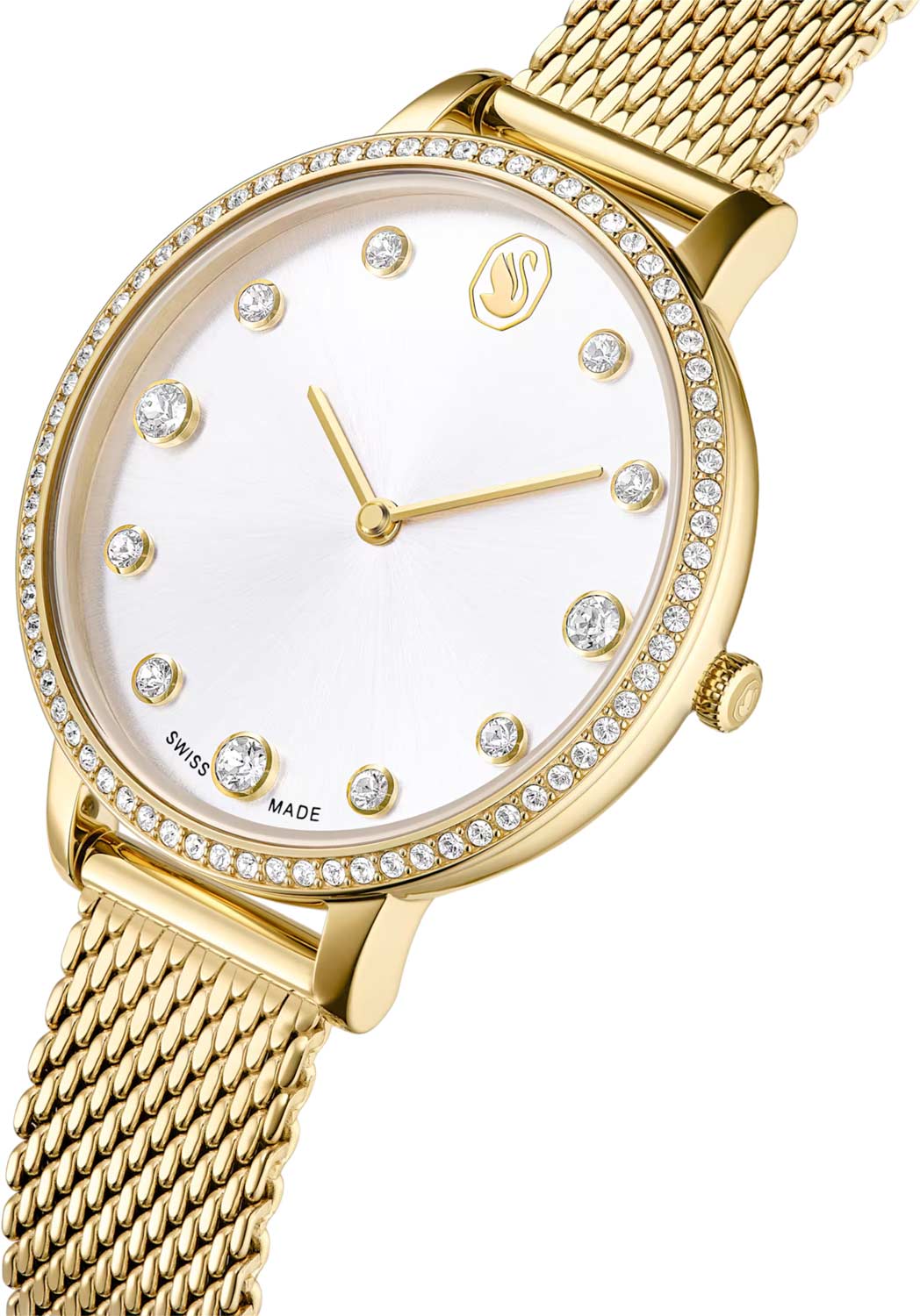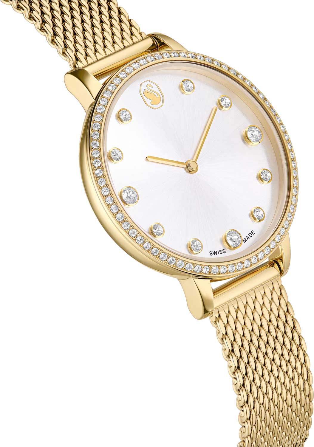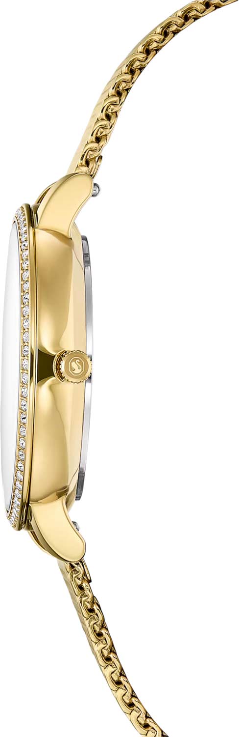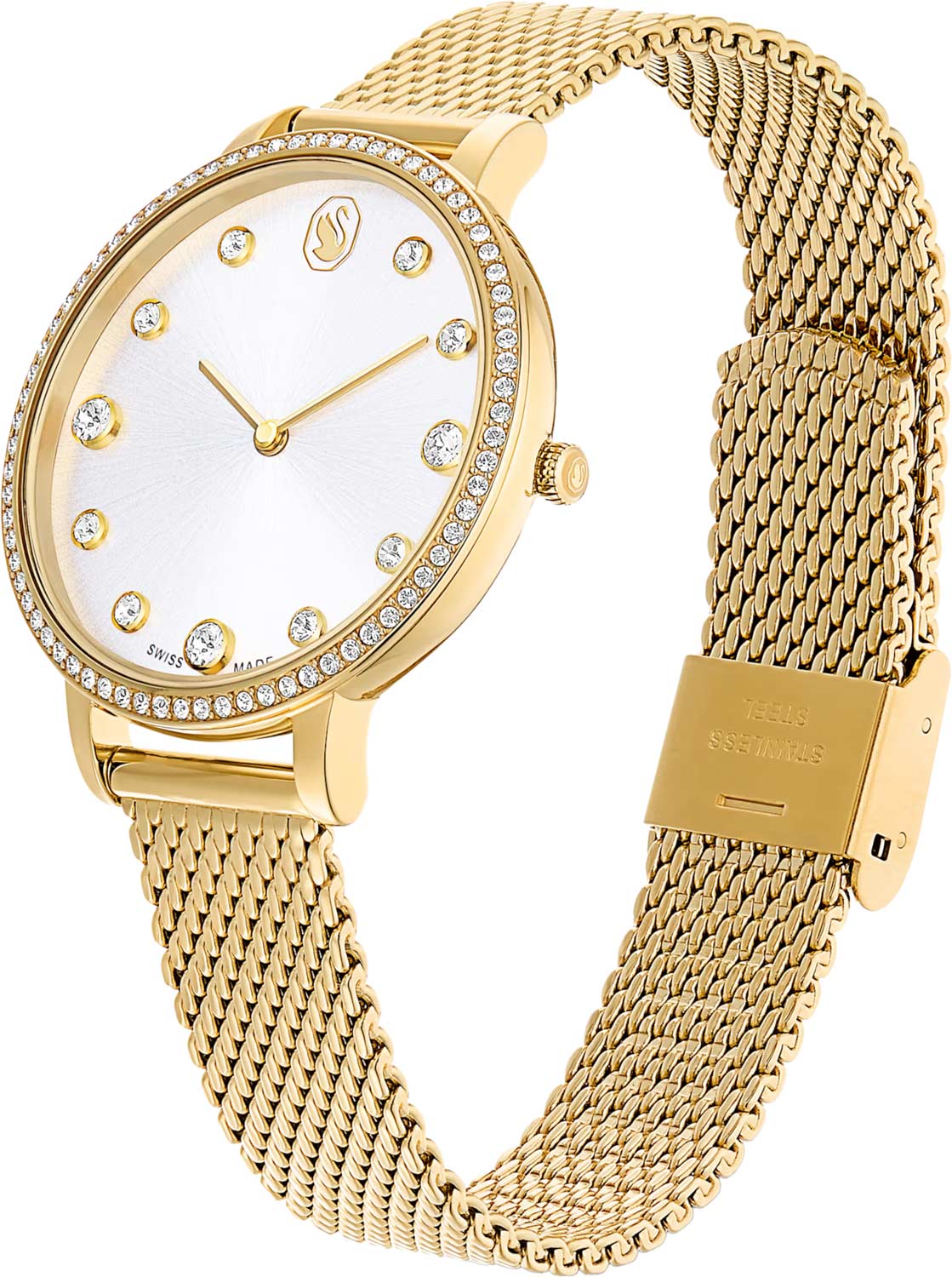 Метки в виде точек, инкрустированных кристаллами Swarovski круглой огранки. Заостренные узкие прямоугольные стрелки в стиле Baton. Секундная стрелка отсутствует. Рифленая заводная головка. Стальной браслет миланского плетения с PVD покрытием оттенка золота.