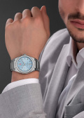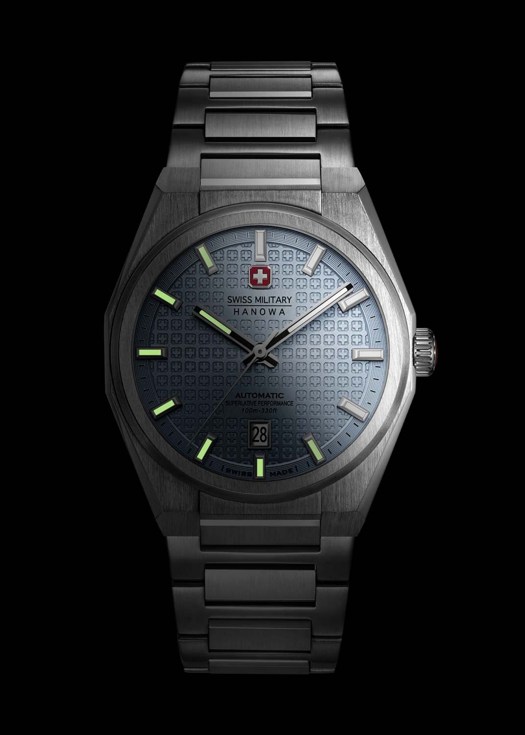 Стрелки и метки с люминесцентным покрытием, которое светится в темноте после непродолжительной зарядки на свету. Завинчивающаяся рифленая заводная головка украшена логотипом. Прозрачная задняя крышка. Стальной браслет с раскладывающейся застежкой.