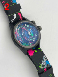 Nylon The Neon Z Black. часы украшены флуоресцентными красками, цвета которых становятся ярче под воздействием ультрафиолетового света. Лимитированная серия - 444 экземпляров. Круглый стальной корпус с черным нейлоновым покрытием. Циферблат часов с гордостью демонстрирует достижения технического прогресса - батарейка и разноцветные провода, проводящие ток. Электронный модуль собственного производства. Кнопка в положении 2 часа активирует светодиодную белую подсветку. Механизм часов и светодиодная подсветка питается от отдельных батареек. Часы защищены закаленным минеральным стеклом K1. Удобный NATO-ремешок из телячьей кожи с классической застежкой.
