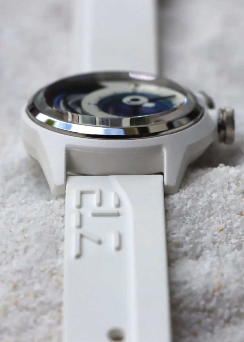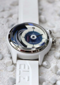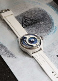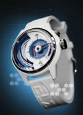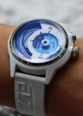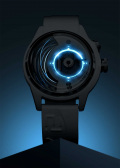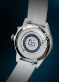 Циферблат часов с гордостью демонстрирует достижения технического прогресса — батарейка, медная катушка, проводящие ток кабели. Метки в виде штрихов. Ремешок с классической застежкой и системой быстрой замены.