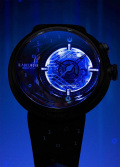 Запатентованный модуль собственного производства в сочетании с механическим механизмом. Кнопка в положении 2 часа активирует светодиодную синюю подсветку. Циферблат с метками в виде штрихов. Ремешок с классической застежкой.