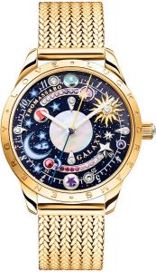 Женские часы Cosmic Amulet с круглым стальным корпусом с IP покрытием. Циферблат с космическими объектами и символами удачи инкрустирован фианитами. Метки в виде арабских цифр. Гравировка на безеле Love-Luck-Dreams-Energy (Любовь-Удача-Мечты-Энергия). Рифленая заводная головка украшена фианитами круглой огранки. Браслет миланского плетения с IP покрытием.