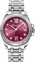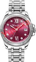 Женские наручные часы Divine Burgundy с круглым стальным корпусом. Рифленый безель. Циферблат выполнен по технологии Sunray (солнечные лучи). Метки в виде римских цифр и точек, инкрустированных кристаллами. Окошко даты находится в положении 3 часа.