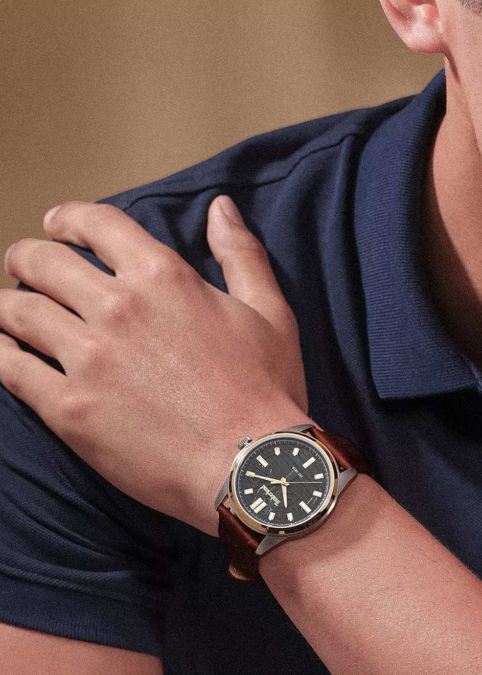 Рифленая заводная головка с логотипом бренда. Завинчивающаяся задняя крышка с гравировкой. Ремешок из натуральной премиум кожи с классической застежкой. Производитель оставляет за собой право вносить изменения во внешний вид ремешка.