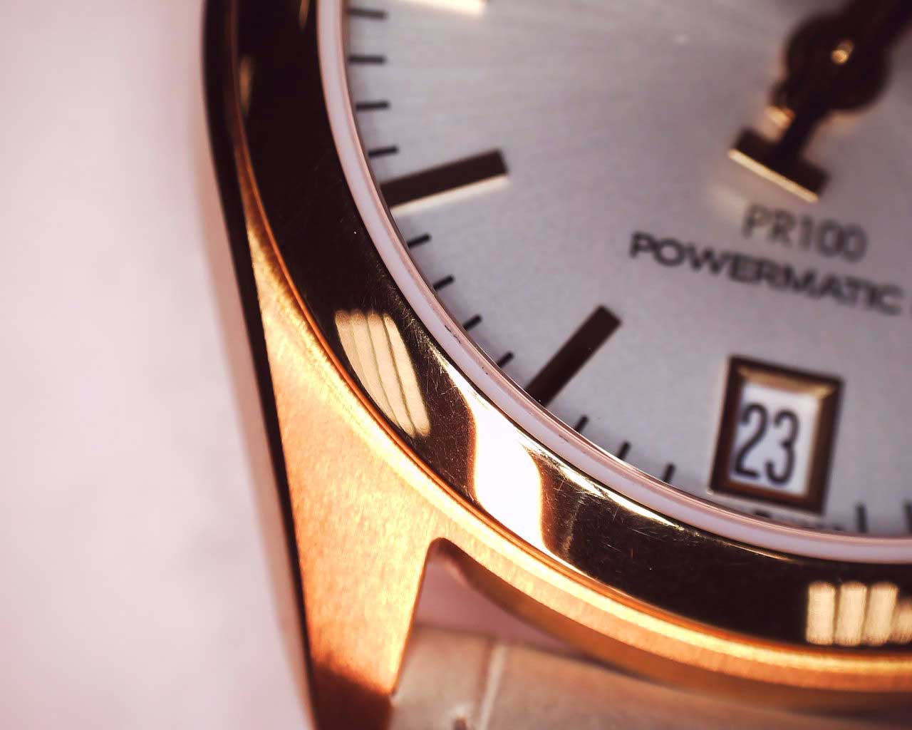 PR 100. Водонепроницаемые унисекс часы. В механизме 23 камня, частота 21600 полуколебаний в час. Запас хода 80 часов. Круглый стальной корпус. Прямоугольные стрелки в стиле Baton с люминесцентным покрытием, которое светится в темноте после непродолжительной зарядки на свету. Метки в виде штрихов. Окошко даты находится в положении 6 часов. Удобный кожаный ремешок.