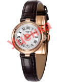T-Lady Bellissima Small Lady. Надежные швейцарские часы. Ультратонкие. В механизме 3 камня. Функция индикации заряда (EOL). Круглый стальной корпус c полированной поверхностью. Центральная часть циферблата украшена гильоше, зона меток выполнена по технологии Sunray (солнечные лучи). Клиновидные стрелки в стиле Dauphine. Метки в виде римских цифр. Окошко даты находится в положении 6 часов. Рифленая заводная головка украшена камнем в форме кабошона. Задняя крышка с гравировкой. Удобный кожаный ремешок с раскладывающейся застежкой.